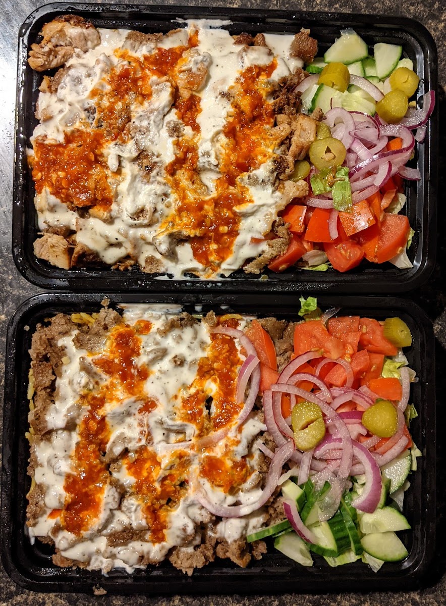 Lamb & Beef mixed Gyro over plain pulao rice with white garlic sauce, hot sauce, salad and green chutney sauce on side