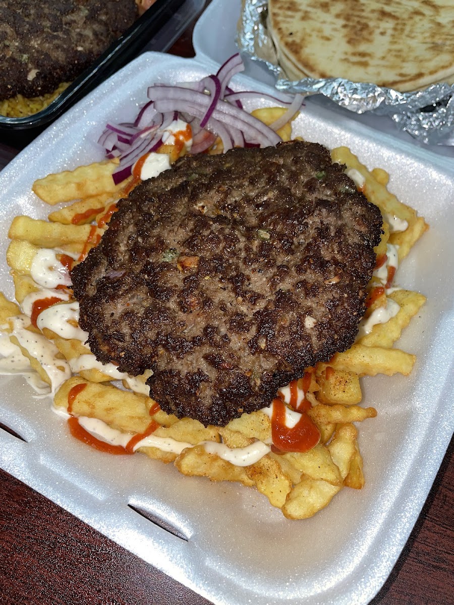 Lamb & Beef mixed Gyro over spicy Biryani Style rice with white garlic sauce, hot sauce, salad and green chutney sauce on side