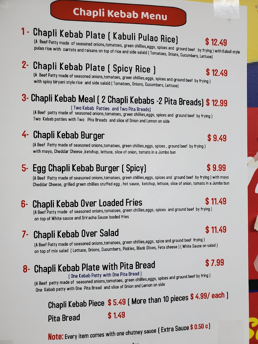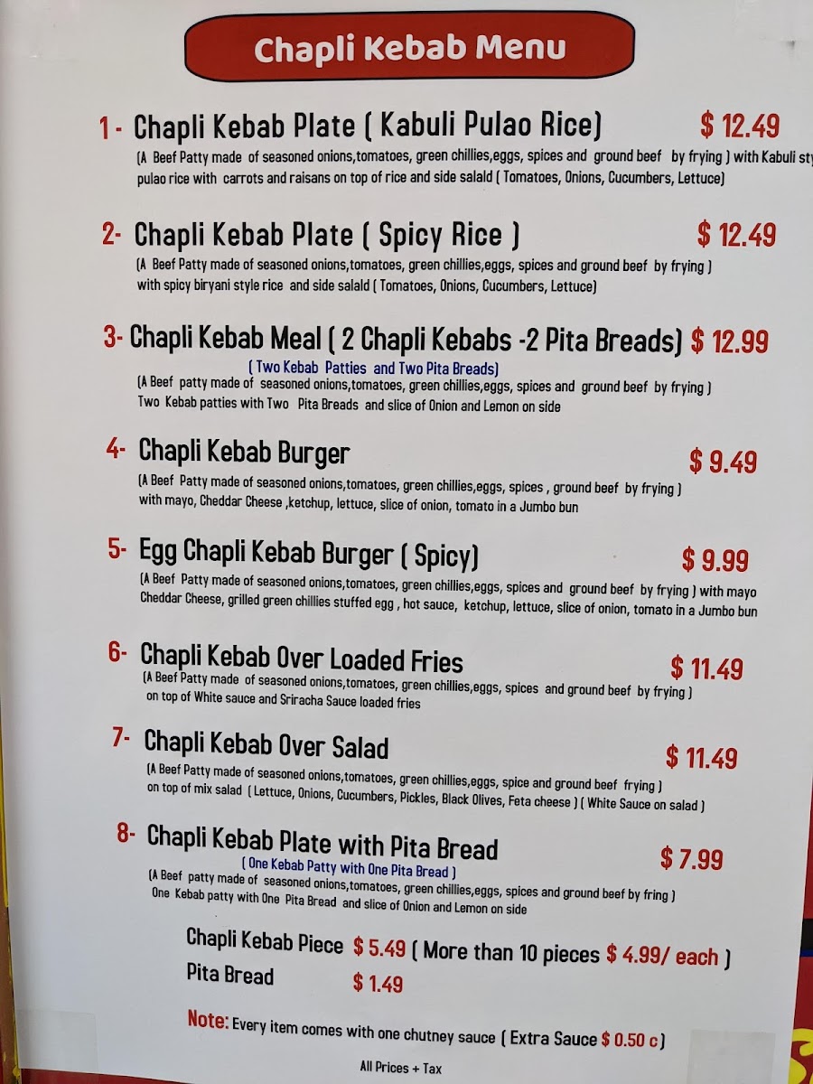 Large Beef Chapli Kabab chopped patty over fries topped with white garlic sauce, hot sauce and green chutney sauce on side